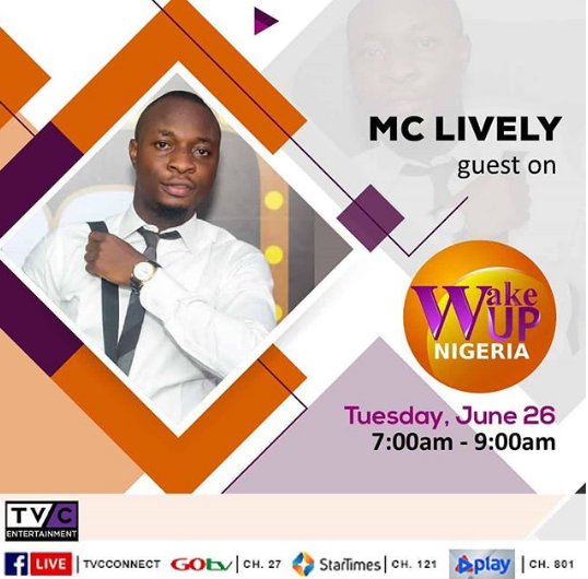 #WakeUpNigeria.@mc_lively_ will be on the show tomorrow, don't fail to tune in at 7am to watch live on Facebook@tvcconnect , Gotv CH.27, StarTimes CH.121, Play CH.801pic.twitter.com/HCwDSf3TYW