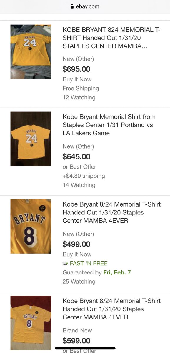 Memorial Kobe shirts from last night’s game are selling on eBay. The only way this is even remotely appropriate is if the proceeds from these sales go to benefit the families involved in Sunday’s crashpic.twitter.com/ripQi4kdir