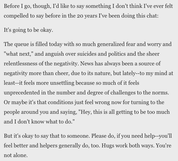 To that end, here is a story about what you can do when a loved one is severely depressed. https://www.nytimes.com/2018/06/07/health/depression-suicide-helping.html …