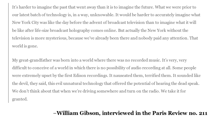 As usual, William Gibson explains my vague unease about life far more eloquently than I can.https://twitter.com/xor/status/1099734488748306432?s=21 …