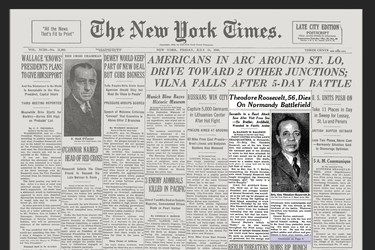 I'm trying to find any item from 1944 on The Times covering Roosevelt's actual death in Normandy, but so far no luck. Either the piece is lost, or even the death of a general and president's son didn't rise in the chaotic summer days of 1944.