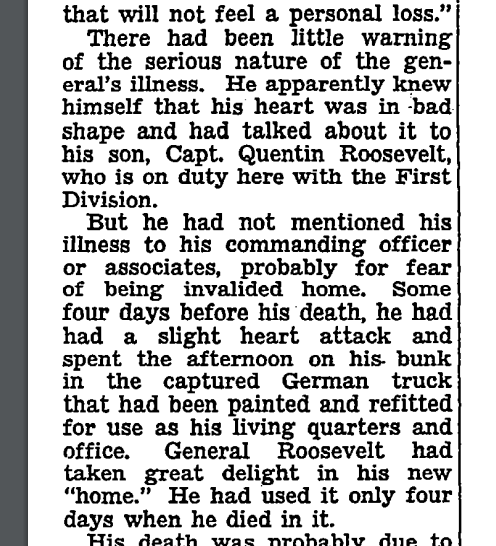 The last few hours of Roosevelt Jr's life. Chatted with his son, who was also serving. Had an earlier heart attack. Didn't tell anyone. Napped a little in a Nazi truck. https://timesmachine.nytimes.com/timesmachine/1944/07/14/87458169.pdf …pic.twitter.com/AtISBDcLaA