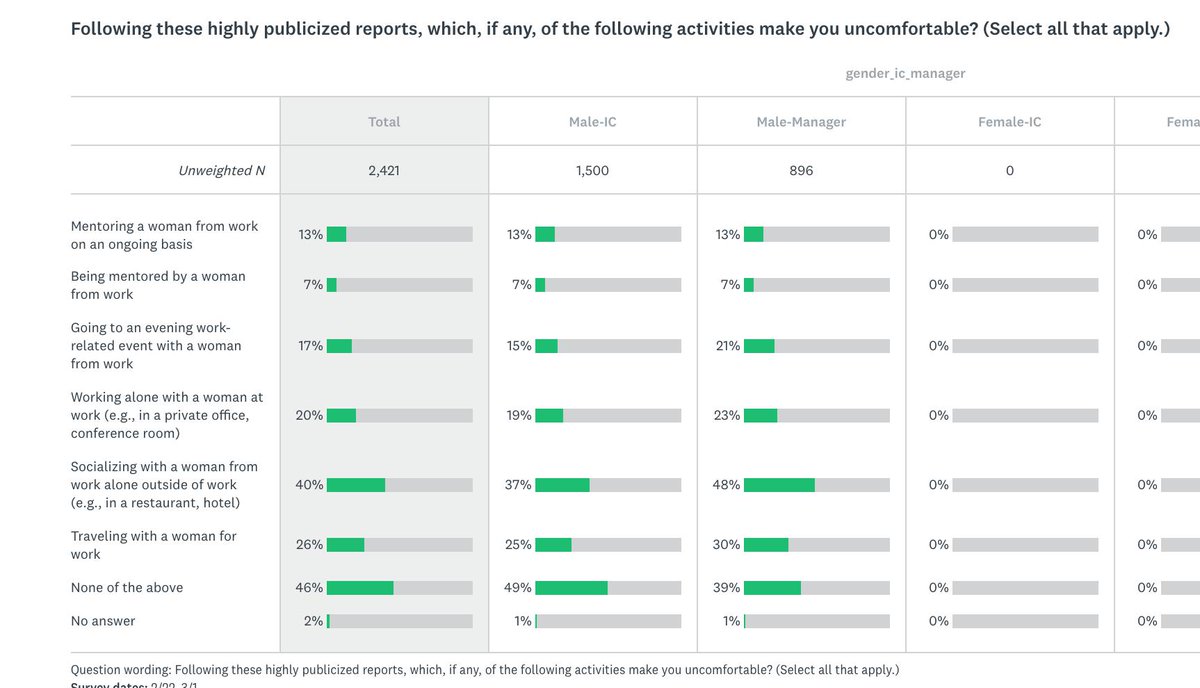 The actual percentage of men, according to that survey, who said they were uncomfortable mentoring women? 13%. (which, again, IS STILL RIDICULOUS but 13 is not the same as 60)pic.twitter.com/lPrEeF0QKQ