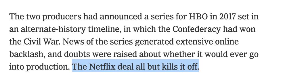 Bonus effect of the GoT guys ditching HBO and going to Netflix: Confederate is, it appears, well and truly dead. https://www.nytimes.com/2019/08/07/business/media/netflix-game-of-thrones.html …pic.twitter.com/y9rCFYq2YF