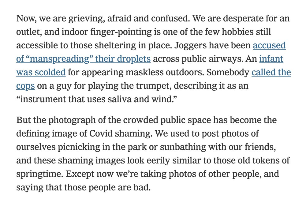 2 great pieces this morning that are a balm against the angst of Doing All Of This Right. 1) The Atlantic on quarantine fatigue https://www.theatlantic.com/ideas/archive/2020/05/quarantine-fatigue-real-and-shaming-people-wont-help/611482/ … 2) Amanda Hess on social media snitchinghttps://www.nytimes.com/2020/05/11/arts/social-distance-shaming.html …