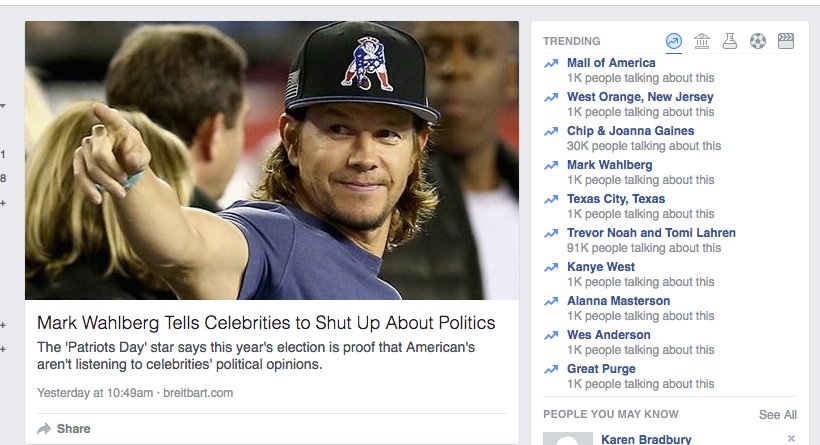 Facebook 'trending' box now just a direct feed to Breitbart. Thanks, Zuck.pic.twitter.com/NPd613BP4w