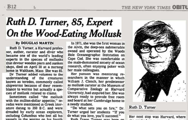 skipping ahead a few decades, I've found this obituary of one of the scientists on Ballard's Titanic-discovery team (incredible headline her.) https://www.nytimes.com/2000/05/09/us/ruth-d-turner-85-expert-on-the-wood-eating-mollusk.html …pic.twitter.com/zmkFAYw7yz