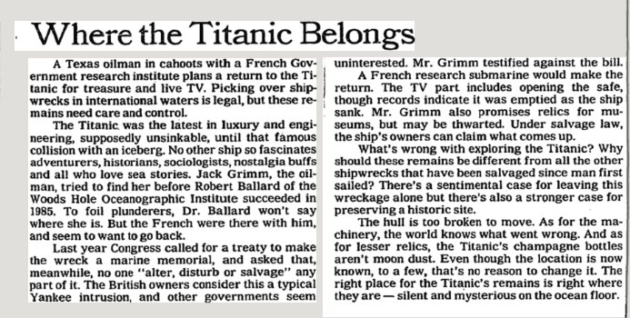 annnnnyway back to the Titanic. In 1987, two years after the discovery, The Times was displeased at plans to raid the watery grave. "A Texas oilman in cahoots with a French Government research institute plans a return to the Titanic for treasure and live TV."pic.twitter.com/2dsQjz4vUf