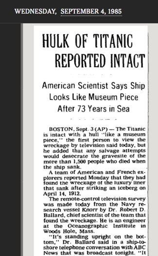 The discovery of the Titanic in 1985 made the front page, but just barely there in the bottom left https://www.nytimes.com/1985/09/03/science/wreckage-of-titanic-reported-discovered-12000-feet-down.html …?pic.twitter.com/dvLVPClvNT