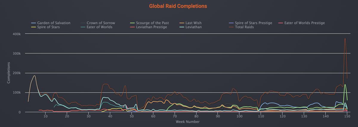 The total number of raids completed last week broke all Destiny 2 records with 376,239 successful raids -- over 2x the previous record of 185,394 in Y1. Every week that we break the Y1 record I will give away an emblem code. RT and follow to enter. https://warmind.io/analytics/raid pic.twitter.com/H2Z8ATRFYN
