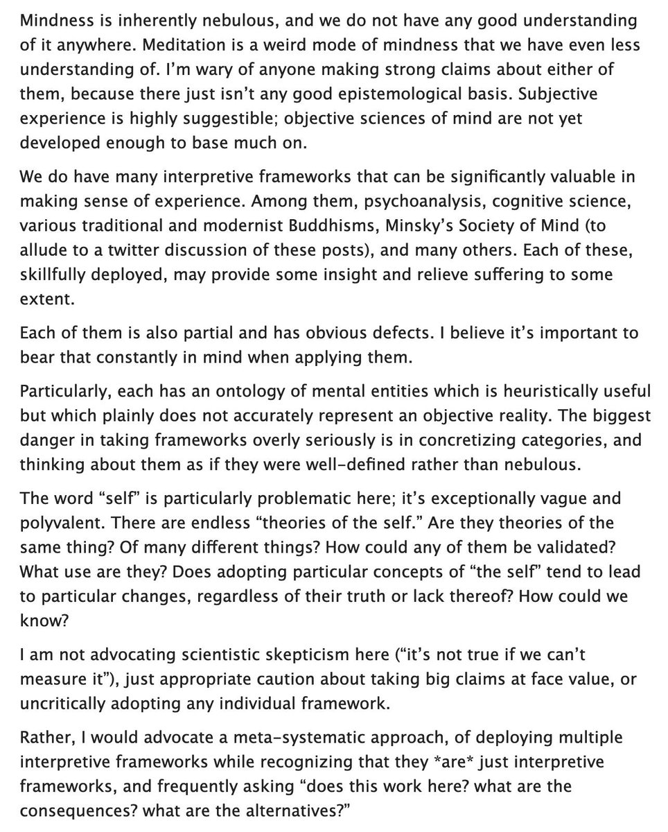 Apply moderate meta-systematic skepticism to all claims about meditation. We don’t have a good epistemological basis to rely on, but multiple interpretive frameworks may be useful in practice. Part of an on-going dialog prompted by