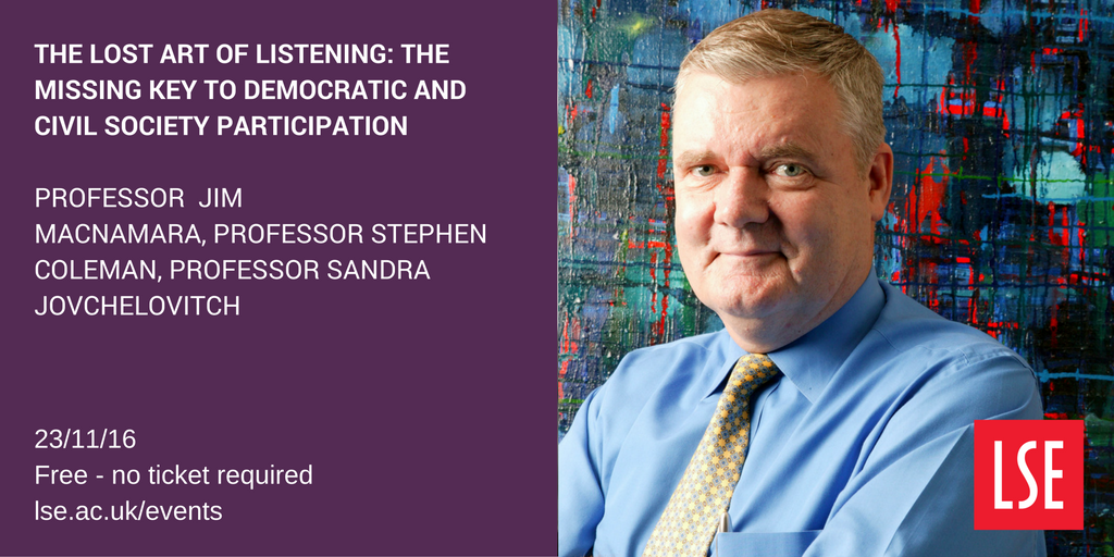 @JimMacnamara's blog on organizational listening here http://blogs.lse.ac.uk/mediapolicyproject/2016/09/27/everybodys-talking-at-me-is-anyone-listening/ … ahead of his LSE event on 23 Nov http://www.lse.ac.uk/publicEvents/events/2016/11/20161123t1830vSZT.aspx …pic.twitter.com/Vb286WArXI