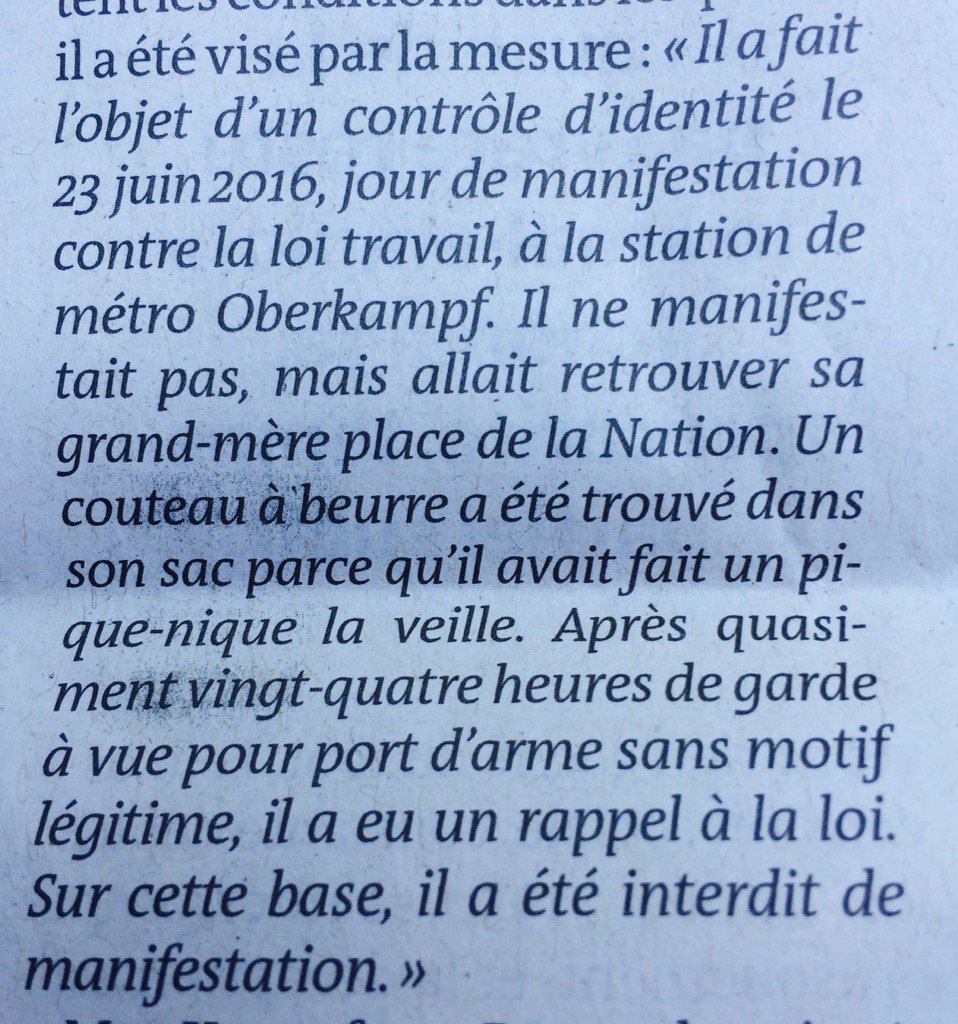 — État d'urgence. Contrôle d'identité. Couteau à beurre. Garde à vue. Interdiction de manifester. (« Le Monde »)pic.twitter.com/zi7wcL6cSQ