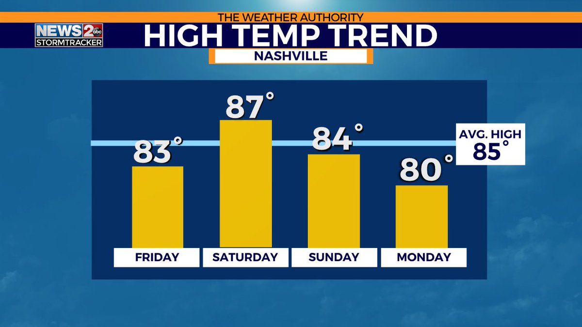 High temperatures will be in the low 80s today, running below average. Saturday we stay hot & humid with unsettled weather returning next week. http://wkrn.com/weather/forecast?utm_medium=social&utm_source=twitter_megtomwx …pic.twitter.com/L6aQB38Uo7