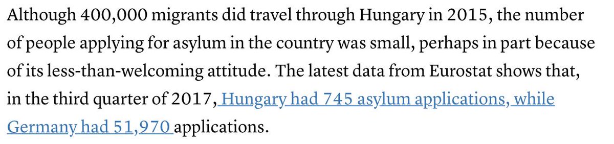 Finally, in his Spectator piece, Douglas Murray says "400,000 people from the Middle East... walked into Hungary." He omits to mention that few of them claimed asylum in Hungary: https://www.cnbc.com/2018/03/19/hungary-blasts-eu-over-migration-says-its-very-irresponsible.html … Yes, he omits key facts in a piece attacking others for omitting things (!)pic.twitter.com/u7ydesAvde