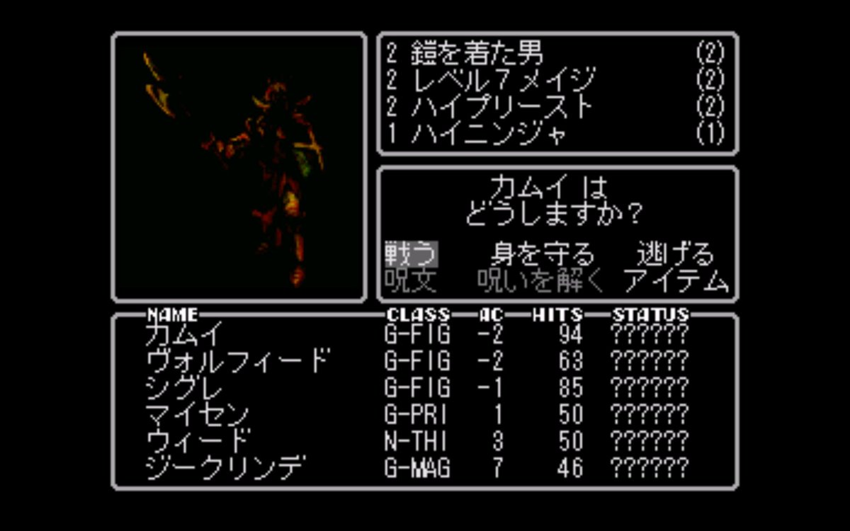 ウィザードリィ リルサガ#1、地下9階でレベル上げ中に魔が差して会いに行ってしまった… きゃー!グレーターデーモンさーん!(※言うまでもなくこのあと全滅した)pic.twitter.com/ogeNMtMzoz