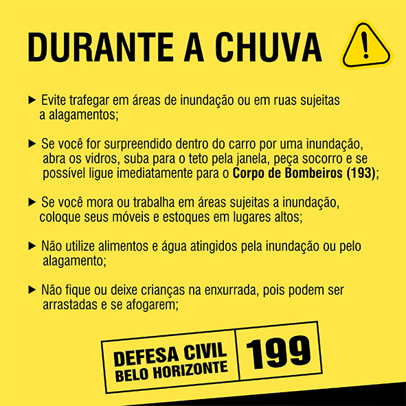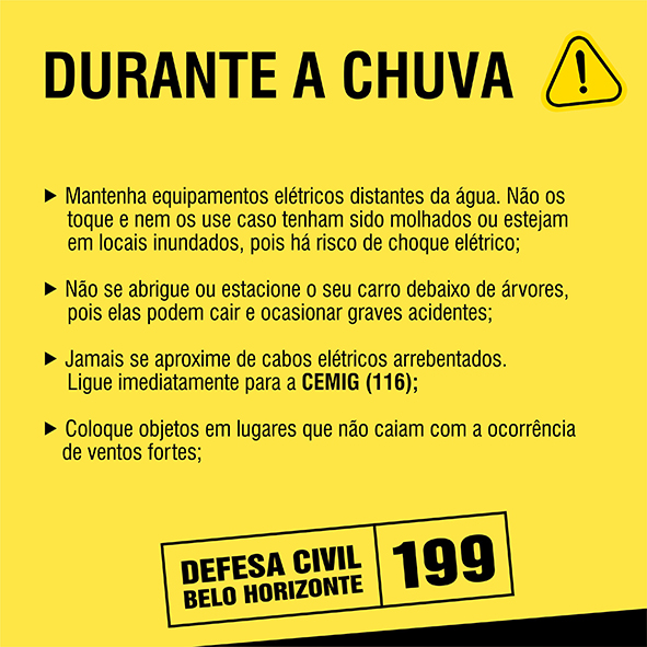 7h17 - Possibilidade de pancadas de chuva (50 a 70 mm) com raios e rajadas de vento que podem superar os 50 km/h, até 8h de quinta-feira (30). Fonte: Defesa Civil de BH