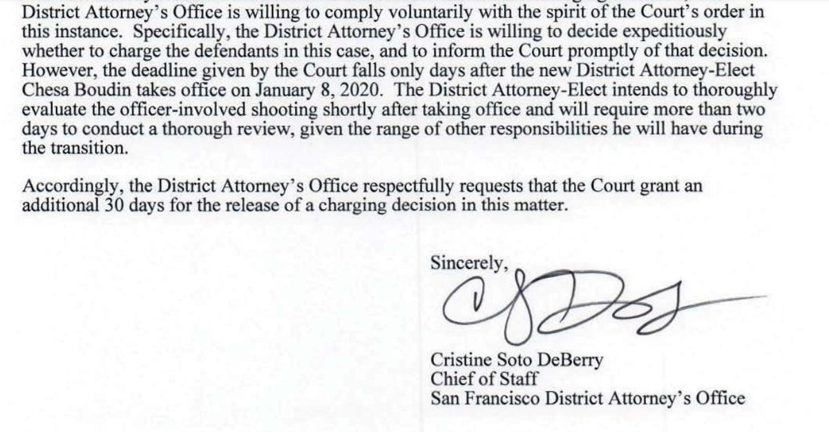 4/9 ... "expeditiously decide" whether to charge either of the officers. At the deadline, Boudin did not announce whether assault charges would be filed. That would not come for 23 months, now, after a civil suit was settled.pic.twitter.com/jb0h2UMtDu