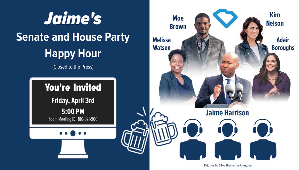 Join us tonight for a South Carolina candidate Happy Hour with @Adair4Congress, @MoeBrownSC, @KimforSC, and @melissawatsonf1.