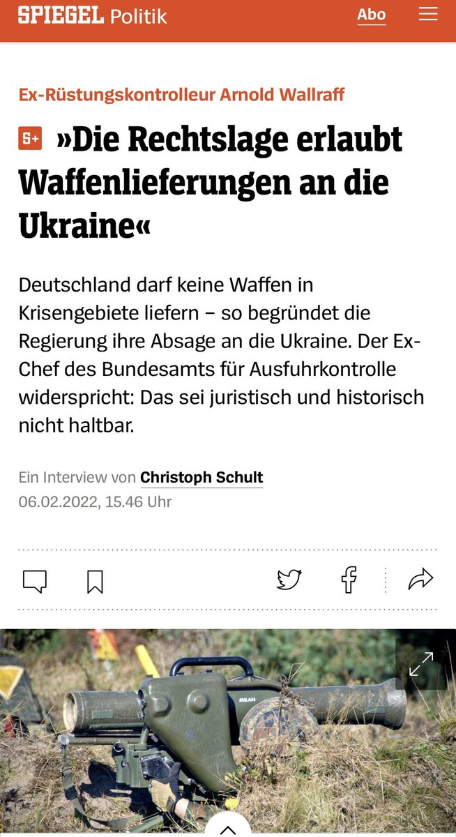 reagiert Arnold Wallraff @derspiegel mit Unverständnis: „Weder deutsches Recht, noch europäisches Recht oder Völkerrecht verbieten den Waffenexport in diesem Fall.“https://www.spiegel.de/politik/deutschland/ukraine-krise-die-rechtslage-erlaubt-waffenlieferungen-sagt-ex-ruestungskontrolleur-a-6a39a2fa-87d7-46d9-935f-1c95f13e5401?sara_ecid=soci_upd_KsBF0AFjflf0DZCxpPYDCQgO1dEMph …Thanks. Twitter will use this to make your timeline better. UndoUndo -