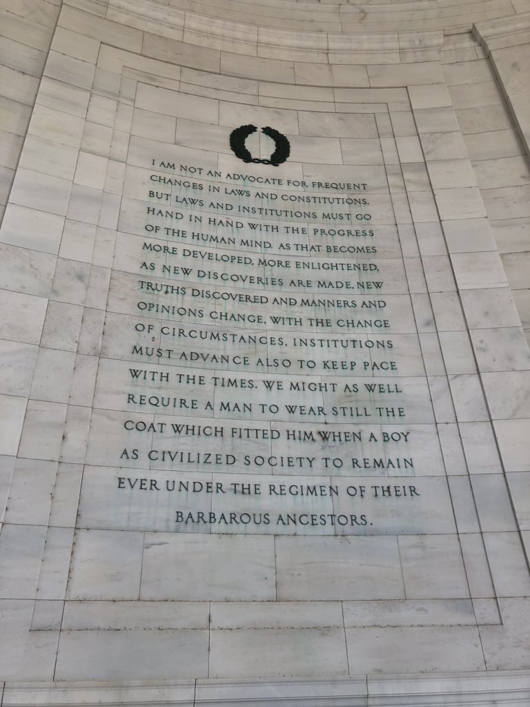 Felt this quote by Thomas Jefferson is interesting in light of today’s talks about gun laws. He says laws & the constitution must change with the times & uses this comparison to prove his point: “We might as well require a man to wear still the coat which fitted him when a boy”pic.twitter.com/MZ2R3TdyYE – at Thomas Jefferson Memorial