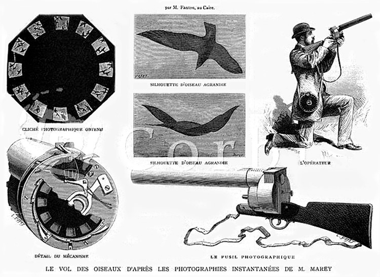 But even that wasn't enough for old Marey. What about fast moving objects / animals? So he invented the chronophotographic 'gun', which allowed him to track animals while shooting onto a plate (still late 1800s)pic.twitter.com/6WmPkzkBFp
