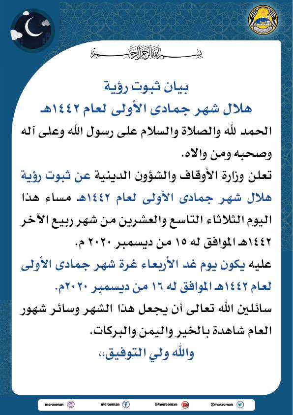#بيان ثبوت رؤية#هلال_شهر_جمادى_الأولى لعام ١٤٤٢ هـ#عمانpic.twitter.com/pggkZHOdhxهذه الوسائط قد تحتوي على مواد حسّاسة. معرفة المزيد
