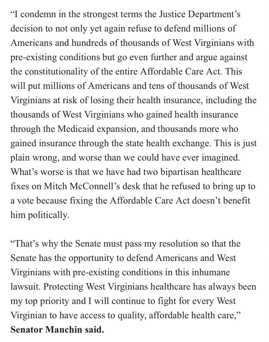 Red state Democrat Sen. Manchin condemns “in the strongest terms” DOJ arguing the ACA is unconstitutionalpic.twitter.com/LM7CM2ZIgK