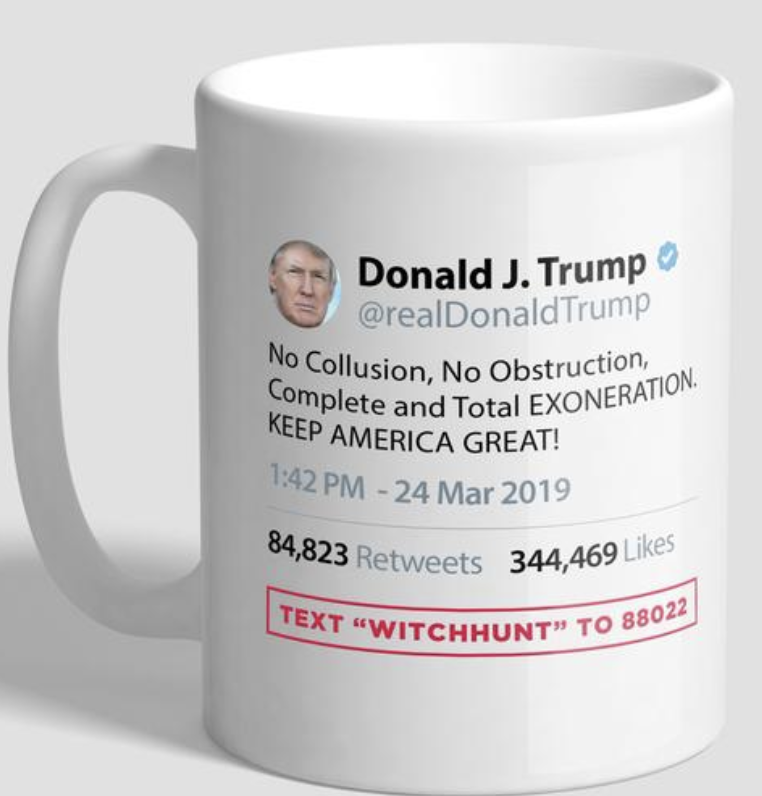 Just perused the Trump campaign website. Beyond a clown face Schiff t-shirt or Space Force hat, supporters can also purchase a Limited Edition "NO COLLUSION!" Trump tweet car decal, koozie, and coffee mug: https://shop.donaldjtrump.com/products/limited-edition-no-collusion-decal …pic.twitter.com/NcTl6ipprG