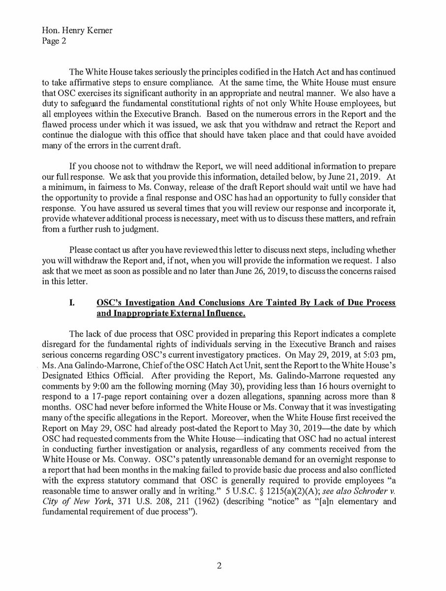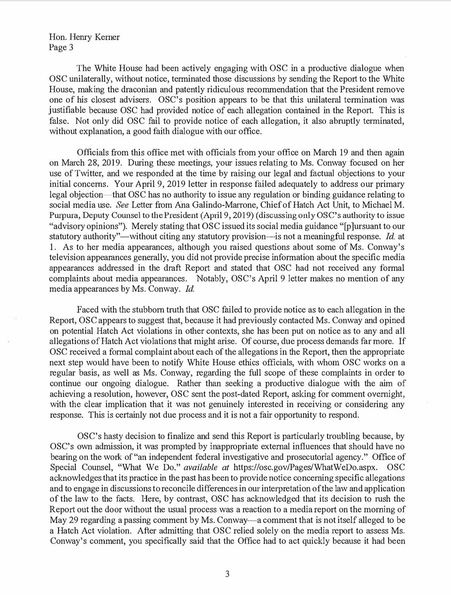Pretty clear from the letter Cipollone is lying about being Conway given "only one night" to respond to the charges. This has been going back and forth for months between the WH and OSC.