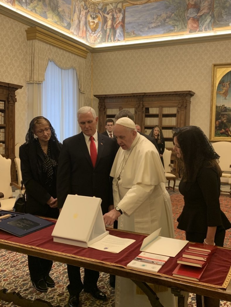 VP Pence and the Second Lady met with Pope Francis and exchanged gifts this morning at the Vatican, photo via pooler @katierogerspic.twitter.com/Y8JOJZuCfa