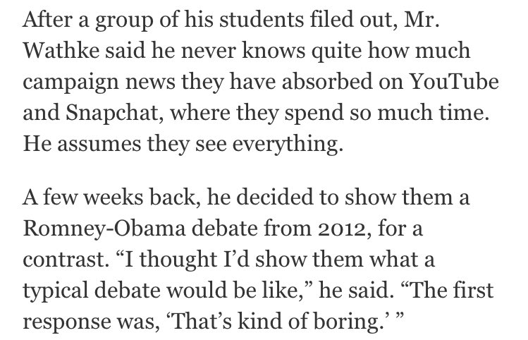 On teaching during this cycle: teacher showed 7th graders Obama Romney debate, for contrast:"That’s kind of boring.” http://nyti.ms/2edIuY7 pic.twitter.com/4AZUTCcbV3