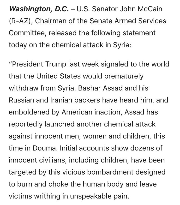 .@SenJohnMcCain comes down hard on Trump over the reported chemical attack in Syria saying Assad was “emboldened” by Trump saying he wanted troops out of Syria:pic.twitter.com/8wGi8C5Mov