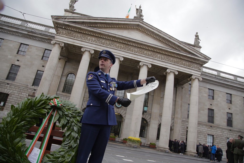 Captain Seán McCarthy of the @IrishAirCorps reads the proclamation outside the GPO @gpowithistorypic.twitter.com/wCNiwxrQxA