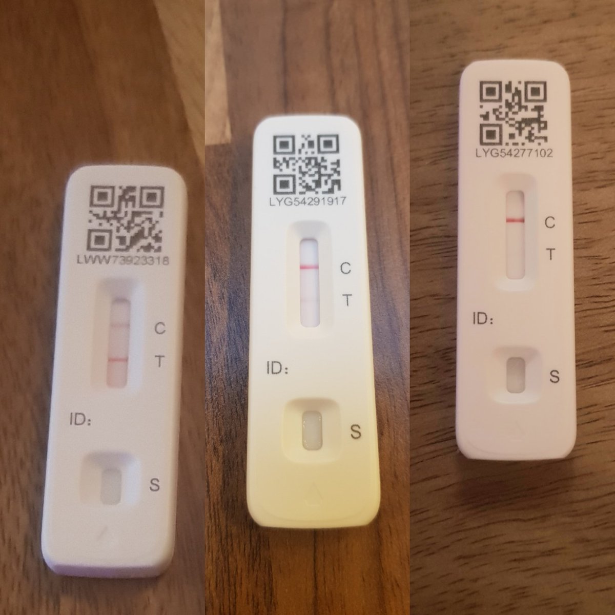 Day 0 (test taken 2h after first signs, negative test day before), 24 and 48h. Band negligible after 30 mins on last one. Negative following day. Pfizer, Pfizer, Moderna with latter 6 days before test #1pic.twitter.com/ZYc9vxGcdo