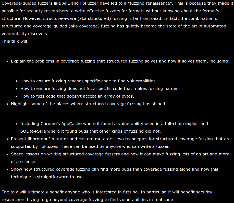Attention fuzzing fanatics: On Wednesday 5PM I'm giving a BlackHat talk (https://www.blackhat.com/us-19/briefings/schedule/#going-beyond-coverage-guided-fuzzing-with-structured-fuzzing-16110 …) on how you can use structure awareness to get *more vulnerabilities* out of coverage-guided fuzzing and cover the techniques to do it like libprotobuf-mutator @BlackHatEvents #BHUSApic.twitter.com/pMvr1INTEV