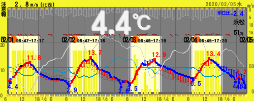 【03:00時点 4.4℃ 51%】 6.2~4.3℃ (北部)★注意報:乾燥(南部)★注意報:強風/乾燥 =静岡県浜松市