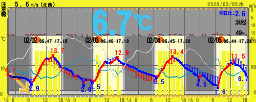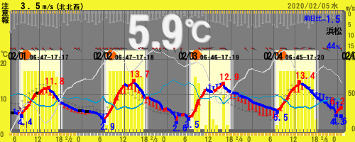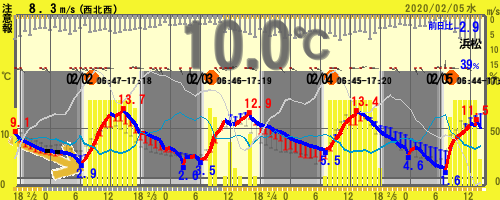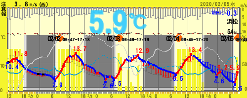 【19:00時点 5.4℃ 54%】 11.5~1.6℃ (北部)★注意報:乾燥(南部)★注意報:強風/波浪/乾燥 =静岡県浜松市