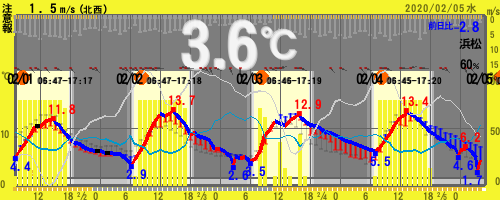 【04:00時点 3.6℃ 60%】 6.2~1.7℃ (北部)★注意報:乾燥(南部)★注意報:強風/乾燥 =静岡県浜松市