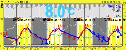 【17:00時点 8.0℃ 47%】 11.5~1.6℃ (北部)★注意報:乾燥(南部)★注意報:強風/波浪/乾燥 =静岡県浜松市