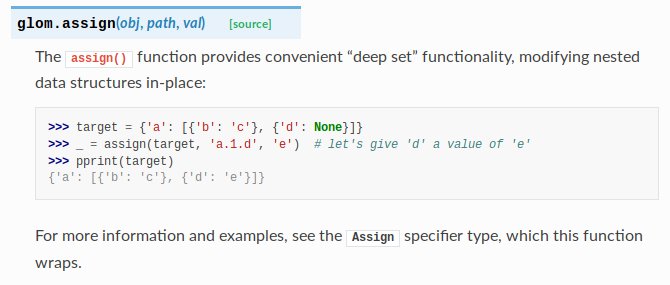 It took a lot of careful design and iteration, but I'm pretty pleased with the way glom's "deep-set" functionality turned out: https://glom.readthedocs.io/en/latest/api.html#target-mutation-with-assign …pic.twitter.com/Dgiu5B8yXl
