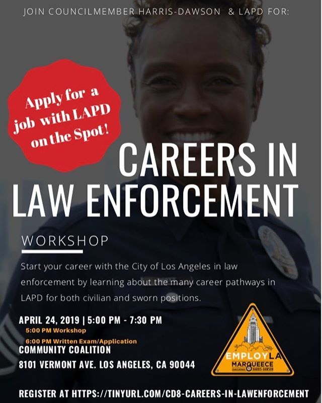 Next week, I am hosting a "Careers in Law Enforcement Workshop" to share several career pathway opportunities with LAPD. Attendees will be able to apply for these jobs on the spot! Don't miss out on an opportunity to begin your career with the City of Lo… http://bit.ly/2PhjY8D pic.twitter.com/d3VXgWp5g6