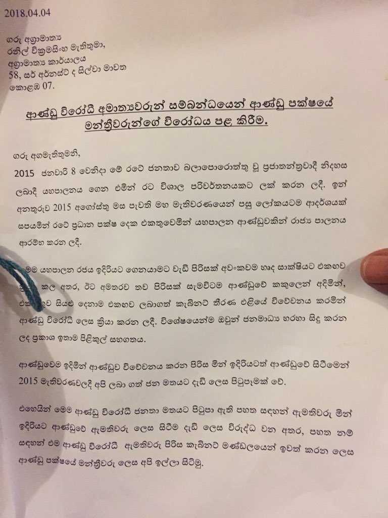 33 UNP MPs signs a letter requesting PM to remove Ministers SB Dissanayake, Dayasiri Jayasekara, Susil Premjayantha, Anura Priyadarshana, Chandima Weerakkody & WDJ Senaviratne who voted against himpic.twitter.com/3TRelI9rEe