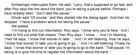 There is a nice bit in one of William Goldman’s books where he talks about a very lengthy discussion between him (the screenwriter), the director (I forget who), and Laurence Ollivier (the lead). Ollivier wanted to change part of _one line_ in the script. They had…