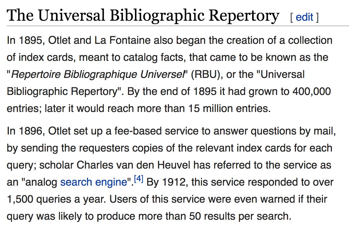 Wikipedia, version 0: Paul Otlet's Universal Bibliographic Repertory (later, Mundaneum)pic.twitter.com/ybY4JgOw9v