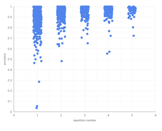 Interestingly, as questions are repeated, people seem to get a little faster at answering them. Here's the marginal review time, showing a slight decrease.pic.twitter.com/2ieATLswPV