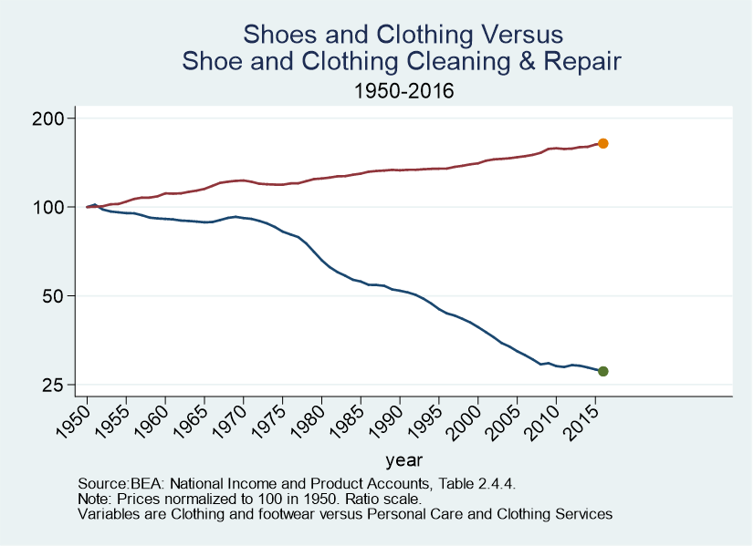 More on the Baumol effect, from @ATabarrok, fascinating graphs showing the rising price of shoes/clothing and car repair, relative to the cost of new shoes/clothing or new cars.pic.twitter.com/9xmUz3Pbiy
