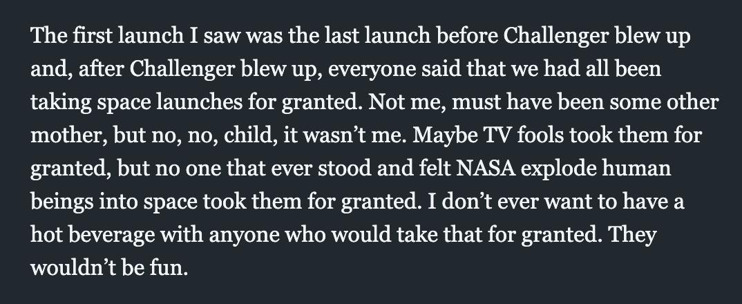 Forgive me if I've shared this before, but it's so good I don't care. "Earth animals are going into space." "The loudest totally good thing you will ever hear." Penn Jillette (of Penn&Teller) on the poignancy and awe of a space shuttle launch: https://symftr.tumblr.com/post/5987695109/nasas-successful-quantifying-of-comedy-timing-by …pic.twitter.com/UJjZiYdJDX
