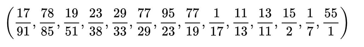 Suppose we replace the number x by the number xf, where f is the first fraction in the list below such that xf is also an integer. If you do this repeatedly from x = 2, then the powers of 2 that appear are 2^2, 2^3, 2^5, ..., 2^p for all primes p https://en.wikipedia.org/wiki/FRACTRAN pic.twitter.com/TKKNgECRc2