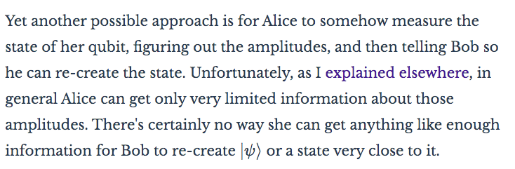 Anyway, for fun: one thing you might think would work is to measure the quantum state, and somehow use that information to recreate it elsewhere. In fact, this turns out to be impossible:pic.twitter.com/bc8MevVhIb